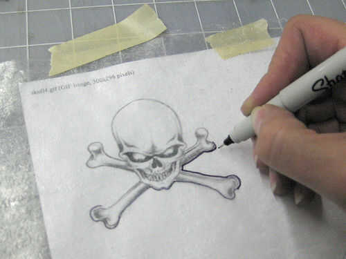 b. contorno de papel de cinta en el espacio de trabajo. Hoja clara fusionada en la parte superior de la cinta. Trazar el perímetro exterior con sharpie punto fino negro. Corte con xacto.