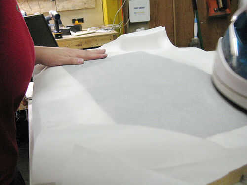 a. prueba fusionar sólo las piezas negras, luego el negro de fusión plus claro juntos. No debe de burbuja, pero puede hacer un patrón interesante de arrugamiento. En el video de bandolera recomienda utilizar papel de cera, pero yo prefiero el pergamino. Las dos mismas piezas pueden obtener a través de todo el proyecto. Cuando son fusión y fusión correctamente, el plástico parece que se vuelve un poco graso y ligeramente se pega al papel.