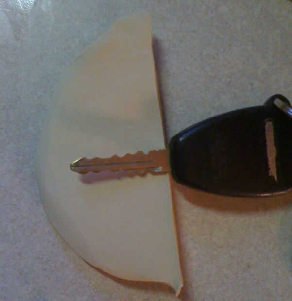 5. Ahora Alinee las dos de la mitad de la arcilla, es una perfección y suavemente aplique presión alrededor de los bordes de la impresión dominante en la arcilla a donde está el mismo grosor de la original.  Ahora puede presionar el resto de la arcilla más lejos la llave juntos para formar un mejor sello para si cualquier led fundido filtre hacia fuera no irá muy lejos.