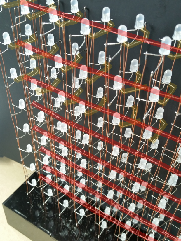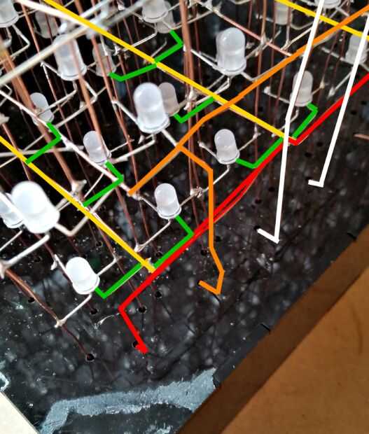 Me olvidé de incluir en el video cómo conectar los ánodos comunes entre columnas. Esperemos que las siguientes imágenes ayudar a aclarar esto. En la primera foto de abajo puede ver las filas que deben agregarse al conectar los ánodos entre sí. En rojo se destacan las filas. Destacado en amarillo son las patillas de ánodo común. Nota cómo el suplente de pernos de la dirección que señalan que sólo necesita la mitad del número de filas (cada par de hojas de acciones un conjunto de filas en lugar de cada hoja con sus propias filas para recoger los ánodos). La imagen siguiente ilustra esto mostrando las dos primeras hojas de LEDs compartir una fila por capa (capas son horizontales, las hojas son verticales). Espero que estoy intentando decir hace sentido. Si no es así, hágamelo saber y voy a intentar volver a escribir esta página o video.
