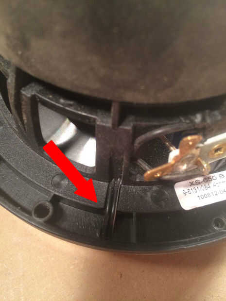En la foto de arriba, tome nota del cable del altavoz de agudos marcado por la flecha roja.