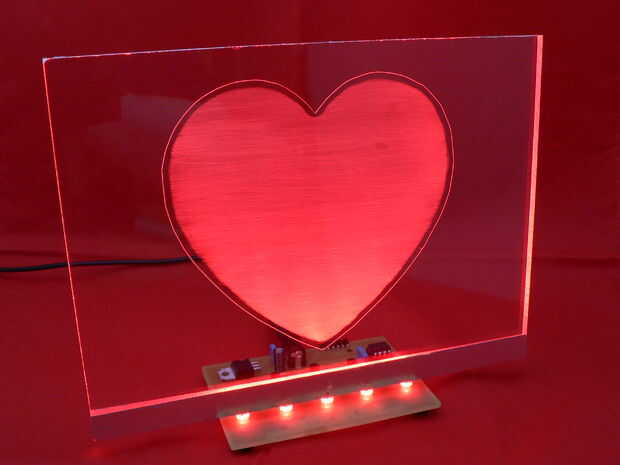 El corazón de amor está hecho de una hoja de 200x150x6mm de plexiglás que se corta y lija para crear el efecto óptico y se montaron en el tablero de control. Incluso si no estás en microcontroladores la pantalla puede ser fácilmente adaptada para mostrar de alguna forma (o formas) te gusta; Además puede ser utilizado cualquier LED de alta intensidad lo que permite crear una pantalla de luz estática usando poco más que algunos LEDs, resistencias y una fuente de energía.