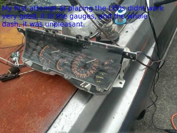 Tuve que rehacer mi un par de veces. Pensé una pequeña tira en el interior de la cubierta del tablero claro iba a funcionar, pero se enciende la pantalla todo y hace más difícil ver los indicadores. Lo que necesita es LEDs dentro de los indicadores, con la cubierta plana negra a la luz sólo los medidores, no toda la visualización.