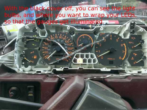 Dejé todos los bulbos en, mi coche tiene un amortiguador, por lo que sólo puedo dim el stock bulbos si quiero, más han quemado de todos modos. Pude han equipado cada bombilla con LED RGB y cableado para arriba, pero pegando una tira de todo los calibres trabajó tan bien y era mucho más fácil quejarse entonces con cada bombilla. Yo probablemente debo han reemplazado las bombillas de los indicadores con LED blancos, porque no bombillas, LEDs pasado un tiempo muy largo.