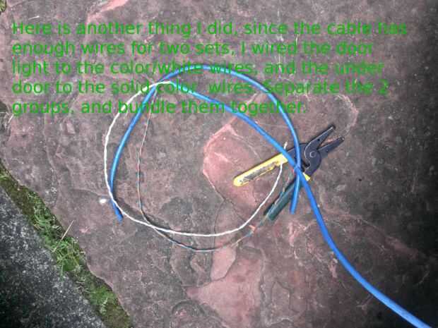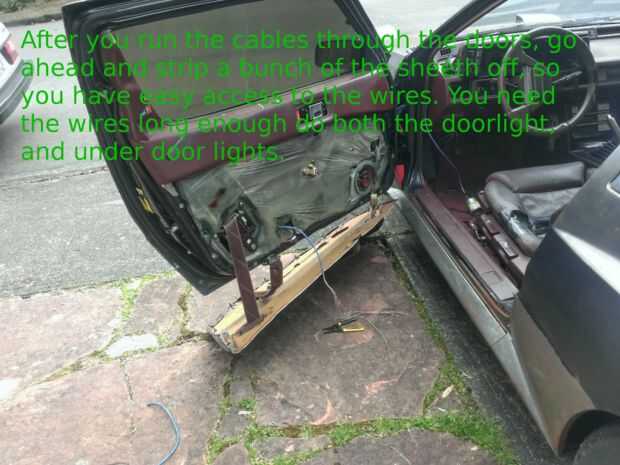 Pongo LEDs debajo de las puertas para poder ver el terreno al salir de mi coche, y lo que es del mismo color que el tablero u otros LEDs es agradable. Me gusta mina en ciclo lento del color, en lugar de sólo un color, es demasiado difícil escoger un favorito. Funcionamiento de los LEDs en las luces de la puerta (ambas luces de puerta de fábrica y el bajo luces de la puerta) requieren ejecutar 4 hilos hasta el interior de la puerta del coche. No necesita cables muy gruesos, ya que su entrega no muy corriente, incluso para ejecutar 50 de ellos debajo de la puerta. Su más agradable si los cables están incluidos en una vaina, como cables de ethernet o de teléfono, eran que tienen muchos conductores pequeños, en un solo cable. Decidí utilizar ethernet, porque era lo que tenía en la longitud que necesitaba. Los problemas con la mayoría de los cables ethernet es que son cable de núcleo sólido, y el aislamiento reduce mucho (su diseñada para prensar, no soldar.) Si es posible que pueda hacer un trabajo más agradable, con conectores de presión, pero prefiero la soldadura.