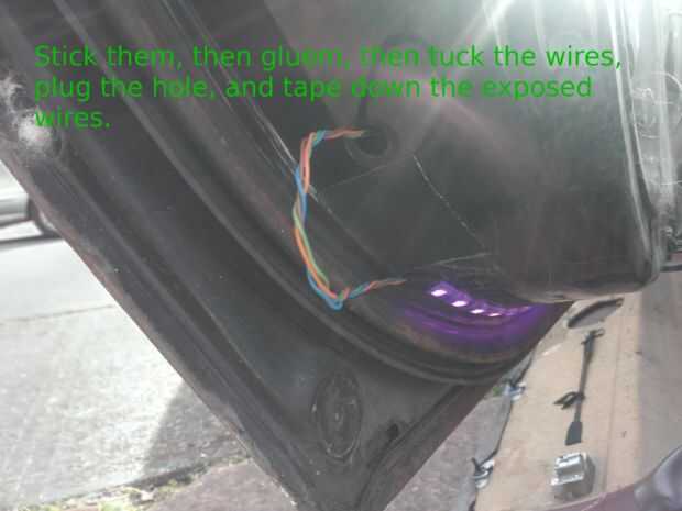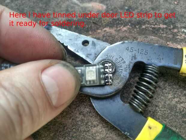 Podría poner conectores en los cables y LEDs pero tendría que pasar por el hueco de la puerta, no quería, y elegí mi tiras directamente a los cables de la soldadura. Después enganchan cosas para arriba, he probado las luces para asegurarse de que todo trabajó bien, luego limpia el flux y soldadura lío.
