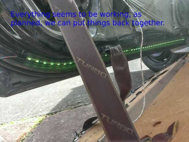 Podría agregar más LEDs que justo debajo de la puerta, poner algunos por encima de los pies, o debajo de los asientos también sería una buena adición. Lo planeado originalmente para añadir algunos a la luz de bóveda, pero después de correr los cables a las puertas, he decidido que la luz iba a ser más esfuerzo que estaba dispuesto a hacer, pero la luz también sería un gran lugar para LEDs más. Algunas otras áreas que podrían ser buenos lugares para LEDs son cajuela, debajo de la bahía de campana o en el motor.