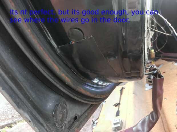 Con los cables a la doorlights y el circuito MOSFET en su lugar, todo lo que necesita hacer para añadir el bajo luces de la puerta corre a 4 cables de las luces de la puerta en la parte inferior de la puerta. Mi coche tiene un agujero con un tapón de goma, pero podría perforar un agujero o agoten los cables entre el panel interior y la puerta. Podría poner una arandela en el agujero y después de poner los cables por medio, poner un poco de RTV en el ojal para que sea resistente al agua otra vez.