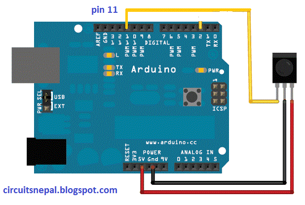 Conecte sus componentes como se muestra en el diagrama a continuación con la ayuda del tablero de pan cuidadosamente. Receptor de infrarrojos es un dispositivo de tres pines y tiene interno op-amp y decodificador. Recibe la señal binaria de IR transmitida desde el control remoto de la tv y envía al pin 11 de arduino.