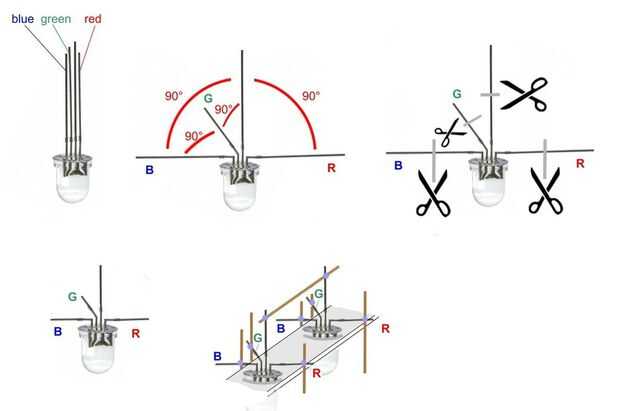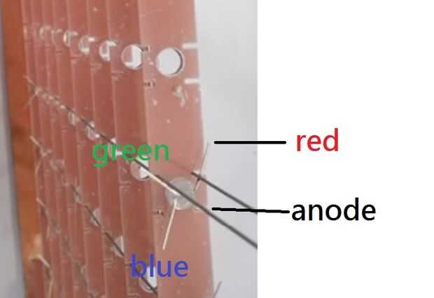 C. soldadura cada uno llevó la pierna verticalmente con alambre de cobre tintado, en primer lugar es el pin azul verde rojo y el pin del ánodo en forma horizontal.