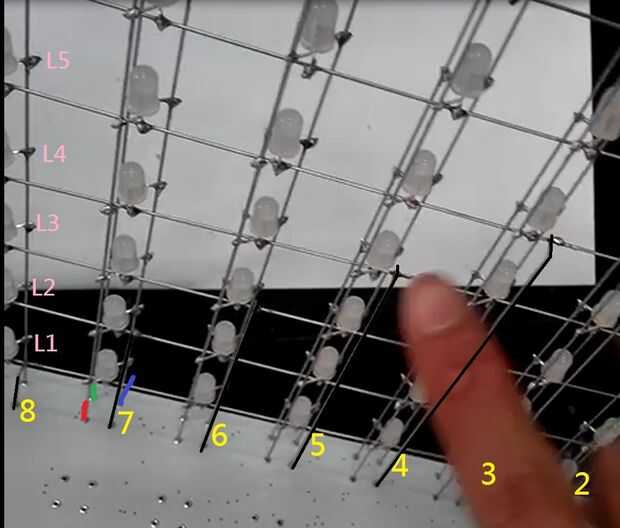Debe probar la capa vertical led con prueba de cortocircuitos multímetro y problema se solucionará fácilmente antes de toda columna cubo soldado, multímetro más barato tiene suficiente corriente para encender el led, algunos pueden que no.