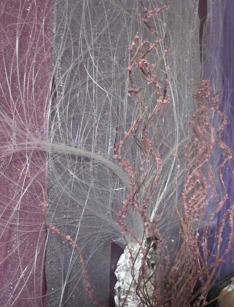 Decidí hacer un árbol ya que no podía montar a través de una pared. El tul estaba pegado en la pared mediante cemento de goma (tul es bastante ligero, por lo que la cinta podría ser suficiente). Las fibras son el hilo a través del tul en un árbol como patrón.
