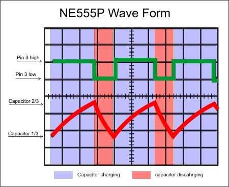 Utilizando el potenciómetro y el condensador, conectado a la 7, 2 y 6 pernos, tiempos de los impulsos que salen del pin 3. El potenciómetro permite que el condensador de carga más o menos rápidamente. Cuando la carga del condensador es 1/3 de la carga principal (la carga principal suele ser la de una batería), establece el pin 3 alta. Cuando pin 6 detecta carga 2/3 establece el pin 3 baja y los cortos del condensador a tierra a través del pin 7, haciendo que la carga se disipe. Entonces cuando la carga del condensador es 1/3 de carga base fija a la clavija 3 de alta otra vez, repitiendo el proceso. A continuación se muestra las reglas del Temporizador 555.