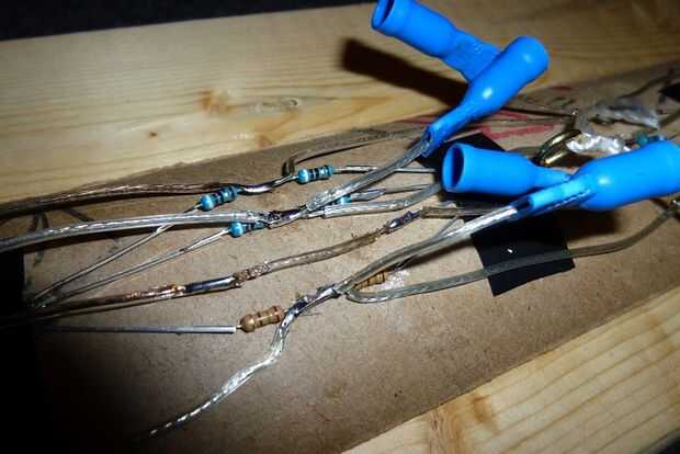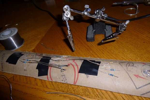 -Las imágenes deben hacer el proceso que suelda obvio. Cada dos LED tiene su propio conjunto de cables. Corte los cables a la longitud medida que avanza. Cada cable será ligeramente diferente, y cortarlas todas a la vez dejará la mayoría de ellos demasiado corto o demasiado largo para utilizar. Asegúrese de que tener en cuenta la longitud del alambre que debe ser despojado también. Probablemente sentirá la necesidad de doblar las resistencias externas en un poco de pulcritud. Recuerde que desea que la longitud tan exacto como sea posible, para evitar que el cable de levantamiento encima de y ser visible desde el nivel de los ojos.