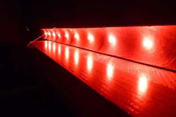 -Repito, trabajar tres a la vez! Elegir un final para comenzar con y poner tres LEDs en sus agujeros. Presione la parte posterior de la cubierta de LED (plástico difusa) firmemente en el agujero como los conductores de la curva para que abrace el tubo lo más cerca posible. Desea con cinta adhesiva en ambos para hacer la soldadura más fácil y la prevención de fuga de luz (a menos que quieras a la luz su techo). Utilizar dos trozos de cinta para cada LED. La primera es atraviese la parte expuesta de la carcasa (sin cubrir ninguna parte de los conductores) y estira firmemente bastante para mantener el LED firmemente en su lugar. La segunda cinta cubre toda la parte posterior del LED para evitar fugas de luz.