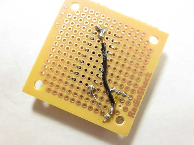 Las cabeceras de pin es para la potencia del circuito. Soldar un cable desde la cabecera de la parte de arriba a la Vcc (del ATtiny2313). El plomo del fondo obtiene soldado a GND de la IC. Compruebe el pinout si no está seguro.