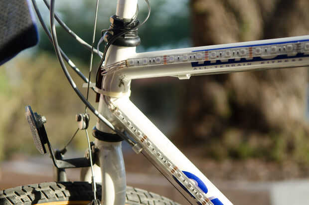 Coloque las tiras de LED en los tubos de la bicicleta. Nos pareció útil para sujetar un extremo y el pivote la tira en el otro extremo para alinear correctamente. Luego lentamente empezar en el lateral sujeta presionando firmemente la tira en el tubo. Es útil disponer de una mano extra aquí.
