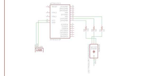 Observe los pines en el ATTiny 2313, estamos usando pin 20 para nuestra fuente de voltaje de 5 voltios desde el cable USB (cable rojo)
