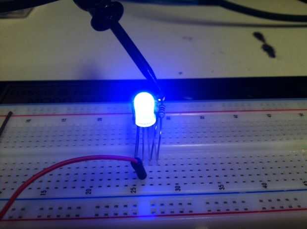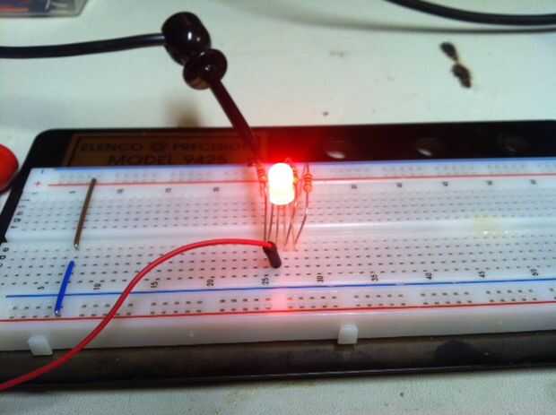 Observe el LED RGB con cuidado, en lado del LED hay un lugar plano, este es tu punto de referencia en que manera los pines son para conectar. Con el punto plano a la izquierda, el perno más largo es el segundo desde la izquierda. Este es el pin común. El cable rojo del LED es la izquierda más plomo, y el conductor común, el cable azul y el cable verde. Cuando cable el LED tenga cuidado de seguir estas pautas.