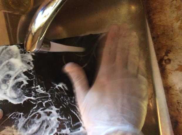La crema no lastimará su fregadero. Sólo de enjuague y limpie (con guantes).