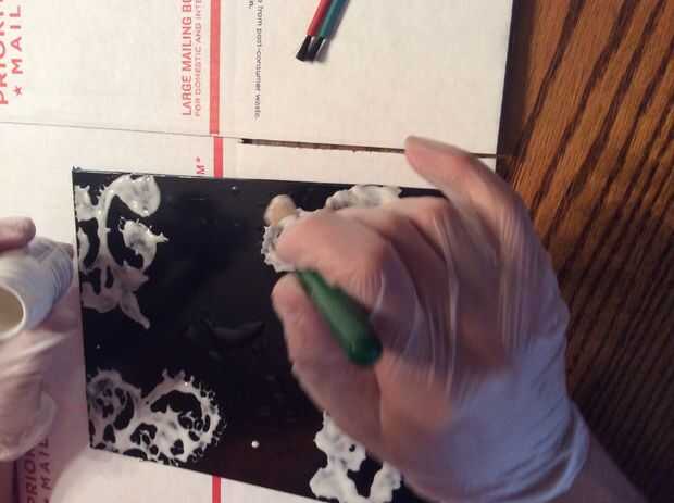 Aplique una capa uniforme de crema a las zonas expuestas de la plantilla de la aguafuerte del vidrio. Si tu crema tiene cristales minúsculos, (como el mio lo hace) debe extender la crema con el dedo y asegúrese de que cada punto está cubierto. Que la crema se siente sobre el vidrio de 3-5 minutos.