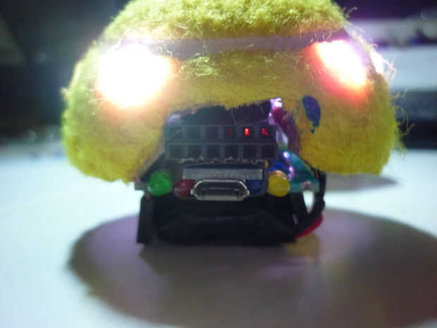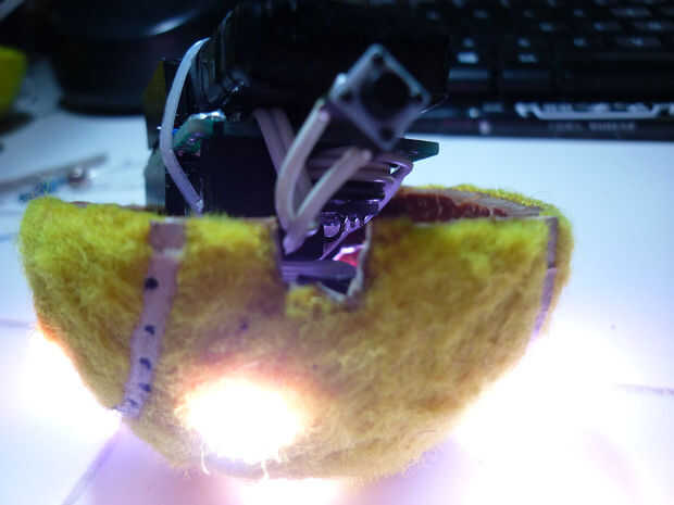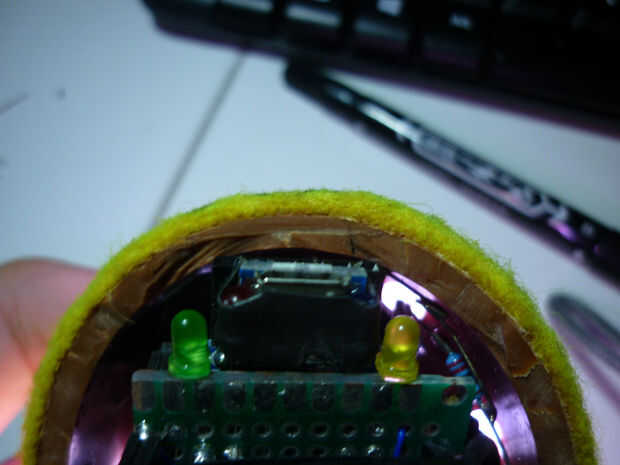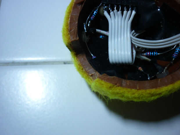 Aislar los pernos encabezado con cinta aislante (para evitar tocar los pernos de la resistencia de la pelota) y colocar el ensamblado de electrónicos en la parte superior de la bola. Tomar el otro lado de la bola y conecte sus cabeceras en la placa de perf y luego aislarlas con cinta aislante. Coloque la parte inferior de la bola y debe cerrar para arriba en una pelota de tenis con una gran costura en el centro.