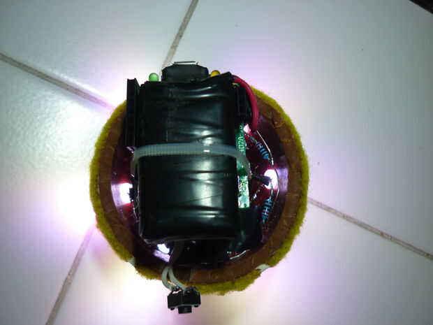 Haz a un lado de la bola y marcar el lugar donde los conectores y el botón que sobresale fuera de la bola y recortarlo. Pegue el interruptor táctil hasta el lugar señalado para ello y enchufe la cabecera para que la mitad de la bola en el tablero de perf. Se trata de la parte superior de la bola.