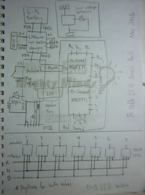Los trabajos de pelota de tenis de LED RGB utilizando el Mini Pro para conducir los MOSFETs que a su vez impulsa 14 LEDs RGB colocan dentro de la bola. Utiliza 6 MOSFETs de canal N para conducir las dos líneas de rojo, verde y Bblue y MOSFETs canal P 7 a los ánodos de los LEDs RGB.