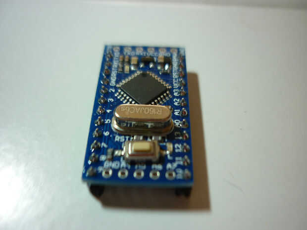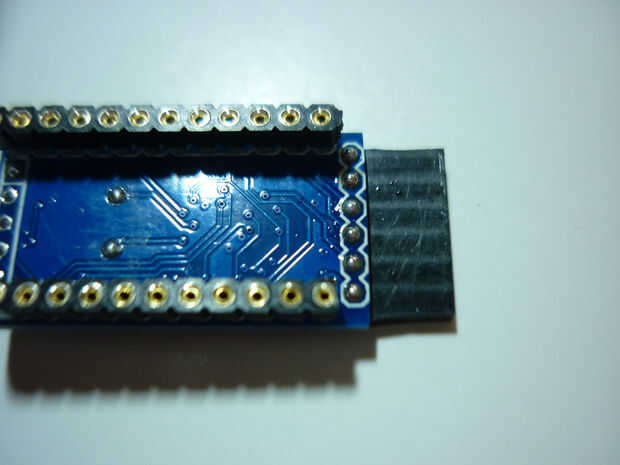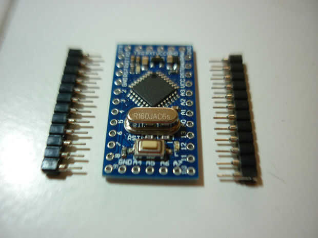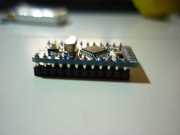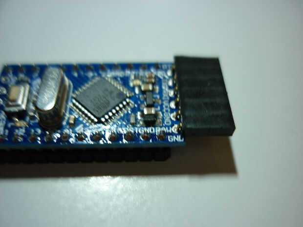 Para el Mini Pro, necesita soldar las cabeceras de pin de vuelta a él para que puede ser conectado en la placa perf más adelante. Usé vuelta pin headers porque es más corto para todo en la pelota de tenis más adelante. También preparar un encabezado hembra de 6 pines y soldadura al encabezado FTDI de la Mini Pro. Quite el pasador para el pin VCC en la cabecera tirando de él hacia fuera antes de soldar o snipping después de soldar.