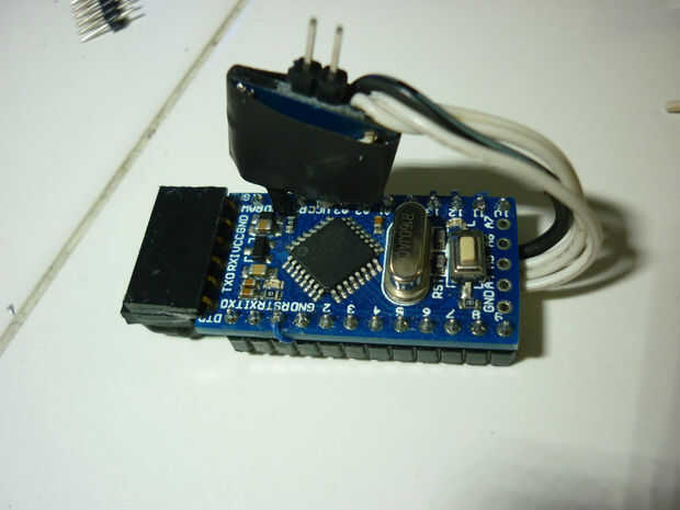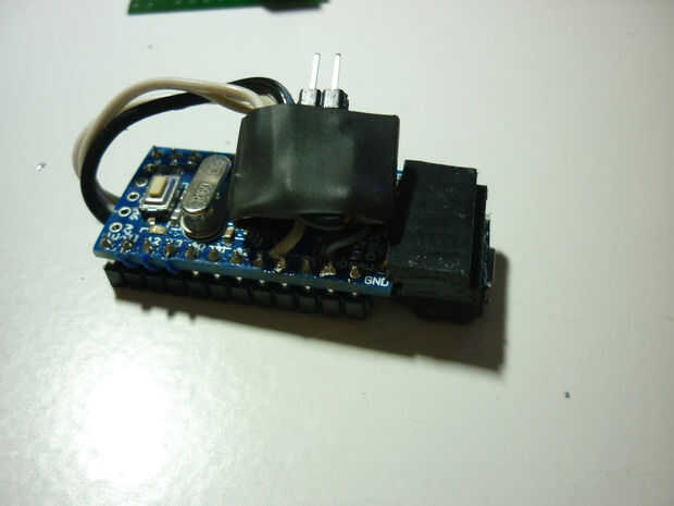 Después de yo los cables de la VBAT y el otro cable GND y el les soldado directamente a los pines marcados VCC y GND en el Mini Pro. Después de probar la conexión era segura conectando una batería en el cargador y observa que el LED enciende pegué el cargador PCB en el Mini Pro.
