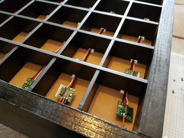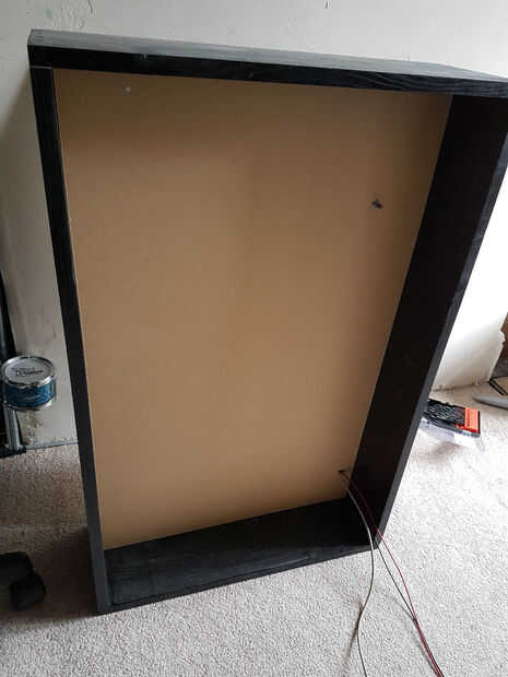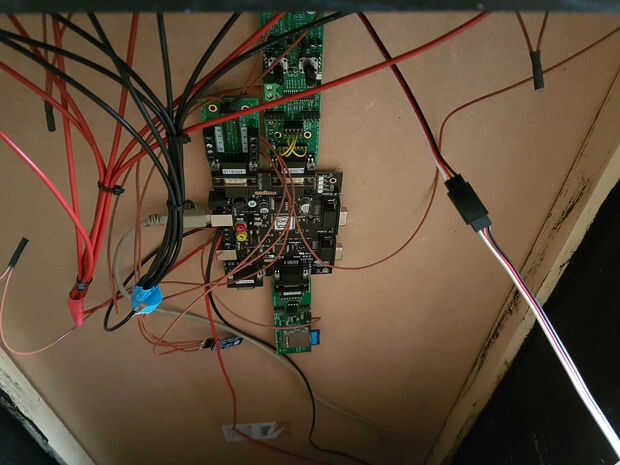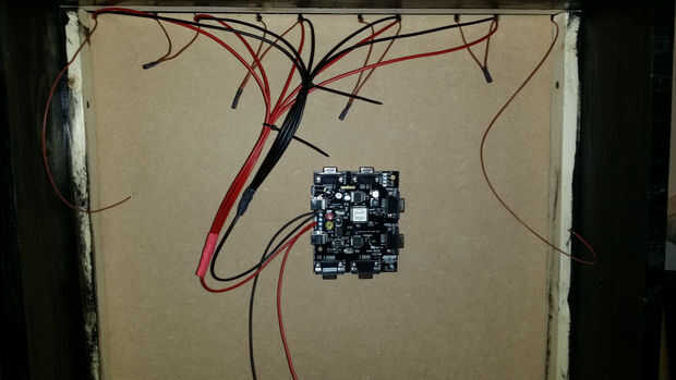 Una vez que estaba contento con toda la electrónica he utilizado una hoja de MDF delgado cortado a la medida para cubrir y proteger todos los entresijos. Luego até los pies en madera con soportes de ángulo para fijar el MDF. Finalmente cualquier nodos que no estaban sentados bastante plana pegué abajo en posición utilizando una pistola de pegamento caliente.