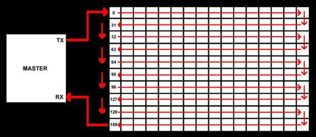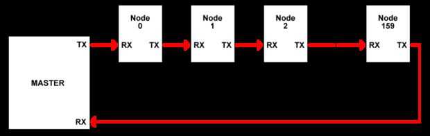 El maestro se conecta a los nodos usando su propia UART periférico. La señal de transmisión del maestro está conectada a la señal de recepción del primer nodo. La señal de la transmisión del primer nodo está conectada a la señal de recepción del segundo nodo y así sucesivamente. El maestro se comunica con los nodos esclavo mediante el envío de una serie de bytes de comando. Cada nodo escucha hacia fuera para los bytes de comando y como se reciben el nodo tiene la posibilidad de reaccionar o modificar el byte antes de enviarla hacia fuera hacia el siguiente nodo y finalmente hacia el maestro.