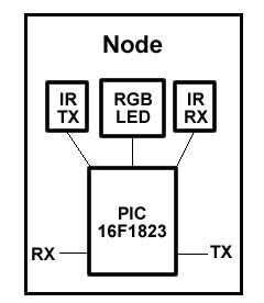 En cambio, decidí crear una cadena de ganglios de microcontrolador inteligente. Cada nodo tiene un solo LED RGB, un emisor de infrarrojos y un detector de IR y que está sobre él. Cada nodo se comunica mediante el periférico serial UART (transmisor receptor asincrónico Universal) a bordo del microcontrolador.