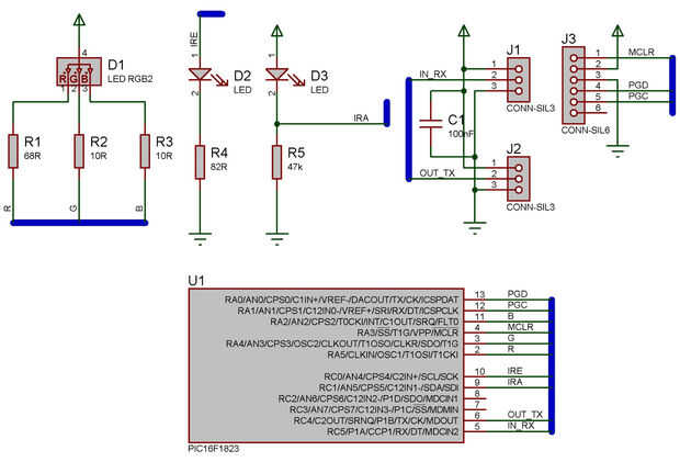 RGB LED es un tipo de ánodo común LED para que el canal correspondiente del LED encendido tirando del pasador de cátodo baja por el microcontrolador. Cada canal tiene un resistor limitador actual permitiendo el LED máximo actual para fijarse en poco menos de 20mA. El color del LED se encuentra activando los pasadores de cátodo de canal LED encendido y apagado a alta velocidad. Cuanto más tiempo el LED está encendido, el más brillante el color se convierte en lo que permite una muy amplia gama de colores para mostrar.