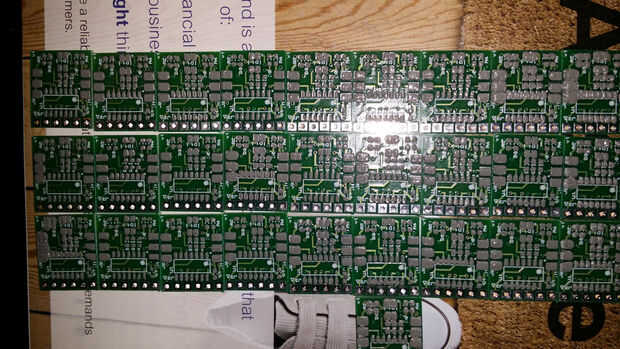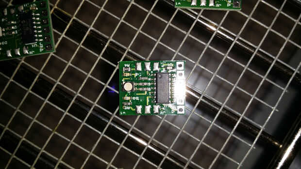 Luego vino produciendo los nodos en grandes cantidades. En lugar de soldar a mano cada PCB opté para hornear los componentes de montaje superficial mediante un proceso de flujo estándar. Tenga en cuenta que si ello no use el horno de casa, el gas liberado de la pasta de soldadura es bastante tóxico y no desea ser cocido al horno en su comida. Simplemente utilizar un horno tostador que he comprado fuera de eBay por 10 libras hornear mis consejos.