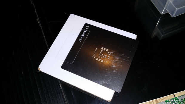 El primer paso fue crear una plantilla para poner la pasta de soldadura en el PCB. Usé mi fiel máquina CNC y enrutados de un bolsillo del tamaño del nodo PCB con una pequeña ranura adicional para permitirme quitar la placa del bolsillo. Luego coloca un PCB en posición y mi máscara de pasta de soldadura se alineó sobre las almohadillas de montaje en superficie. Con alguna cinta aseguró la máscara de goma en posición y esto crea una bisagra para permitirme agregar o quitar el PCB entre aplicar pasta.