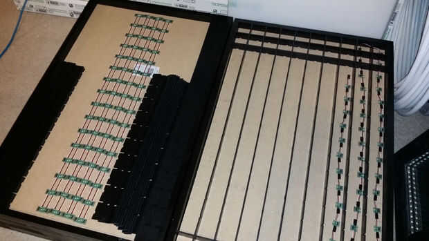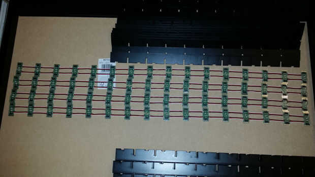 Pasé todos mis nodos de conectarlos juntos en sets de 16. Entonces usando un pedazo un poco más de 3 núcleos de la cinta alambre conectado los sistemas de 16 para hacer sistemas de 32 o dos columnas completos de píxeles sobre la mesa.