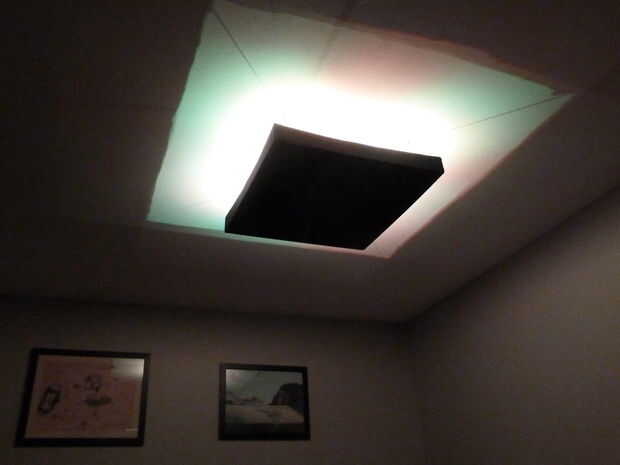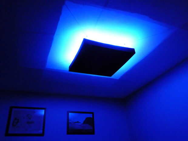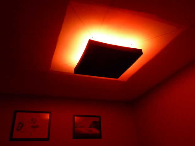 Mi lámpara acabada mide 30 "x 30" cuadrado y es 3.5" alto. Se cuelga 5.5" fuera el techo y utiliza 9 x 3W RGB LED controlado por un microcontrolador PIC de 16F1829.