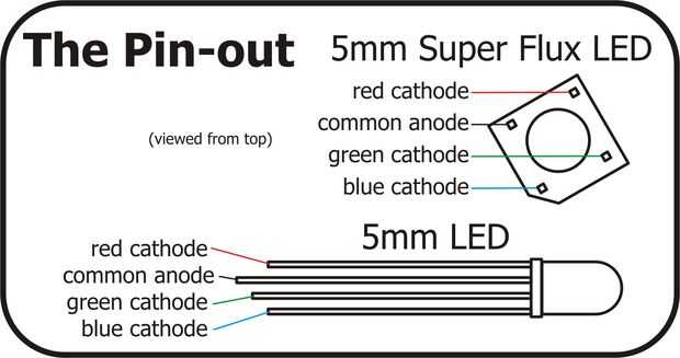 Consulte su hoja de datos de LEDs RGB para su perno-hacia fuera o abajo son los dos factores de forma de LED RGB y pines más comunes.