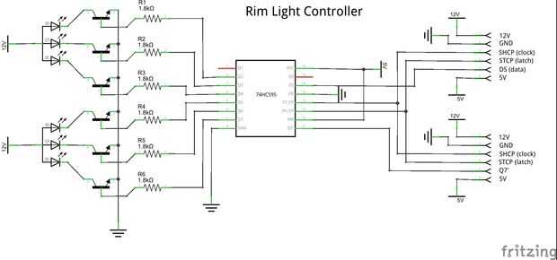 El regulador de luz borde consiste en unas pocas piezas. Primero es la parte de control, un microcontrolador de baratija. Este controlador es barato y tiene la cantidad justa de I / O para el borde de la luces (5). Tiene un conector de batería para conectar una batería LiPo, fusionada con un fusible de vidrio 2A. Un divisor del voltaje cae el voltaje de la batería a niveles seguros a medida con el Abalorio. Un sensor de efecto hall se conecta con una resistencia de pullup obligatorio de 10K. Los restantes 3 pernos se utilizan para los 3 cables de señal a los módulos.