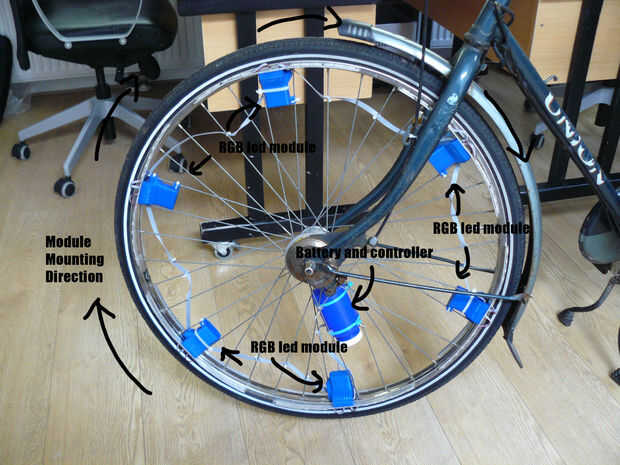 Cuántos módulos se necesita depende de algunas cosas: el diámetro de la rueda, la cantidad de radios en la rueda y la longitud de le led tiras. Por ejemplo, utilizo mi propia rueda. A la altura de donde los módulos deban montarse, el diámetro es 620mm. La cantidad de radios es generalmente un múltiplo de 4 y es en mi caso 36. Para obtener la circunferencia de la rueda, simplemente multiplica por pi.