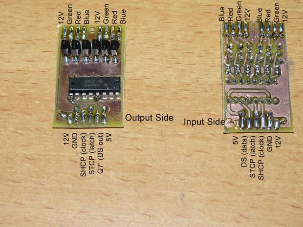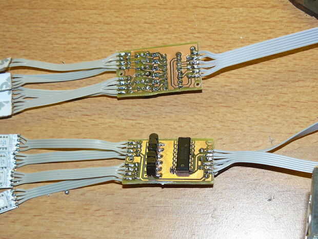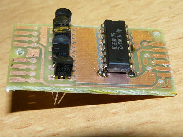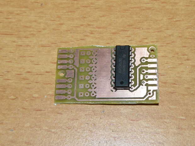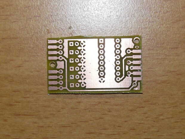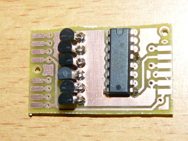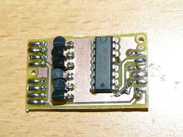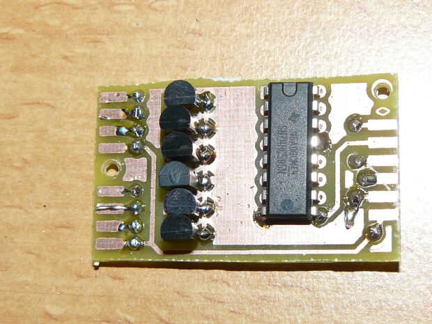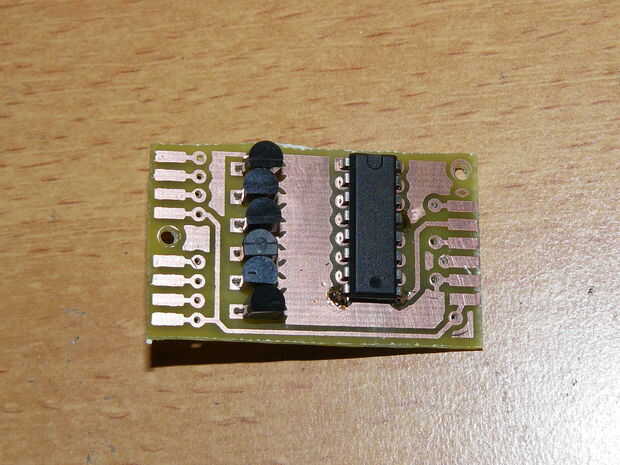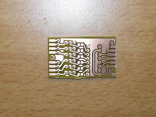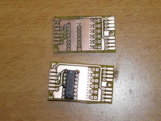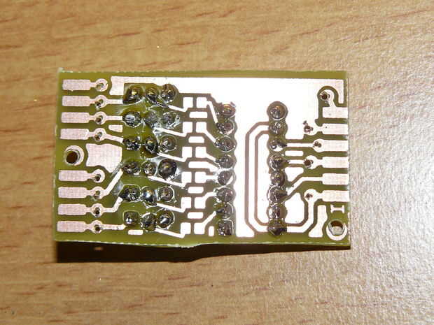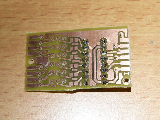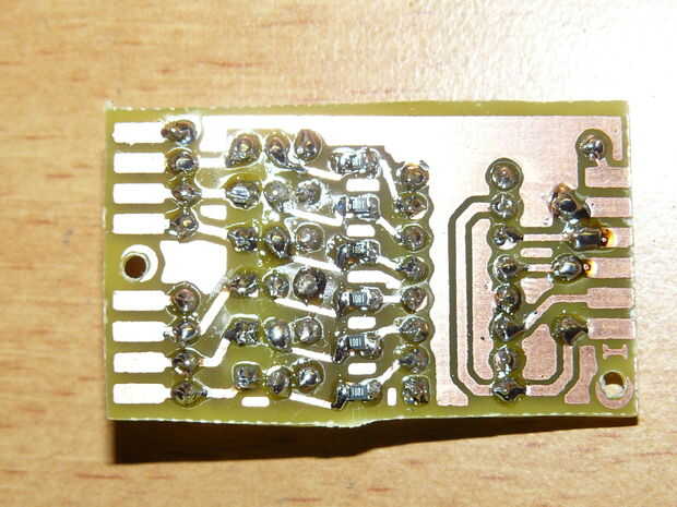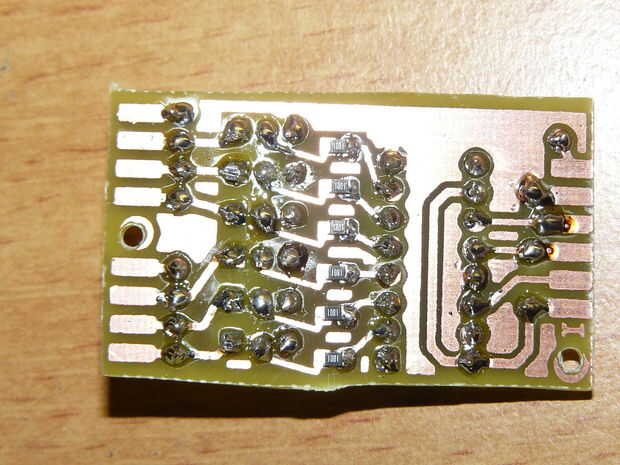 Porque los circuitos grabados casa tienen no a través de placas de orificio, algunas partes tendrán que ser soldadas en ambos lados. Dependiendo de lo bien PCB fabricación herramientas son, puede que necesite limpiar el cobre entre contactos (como debía). Especialmente entre las pastillas de led y de la comunicación, puede haber algunos filamentos finos de cobre izquierda.