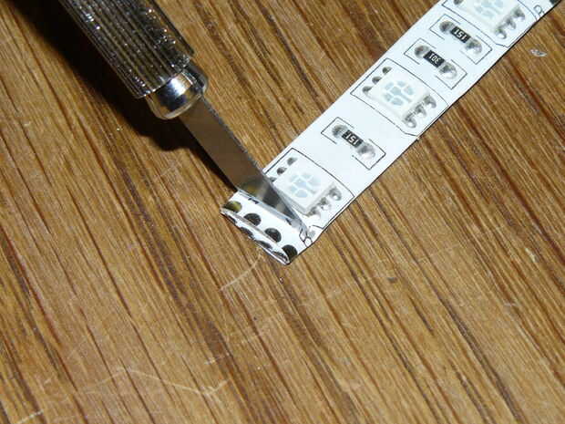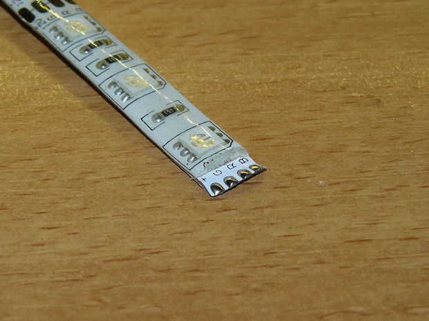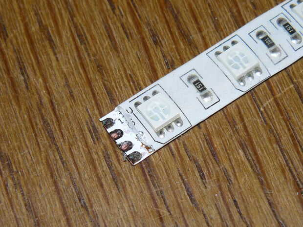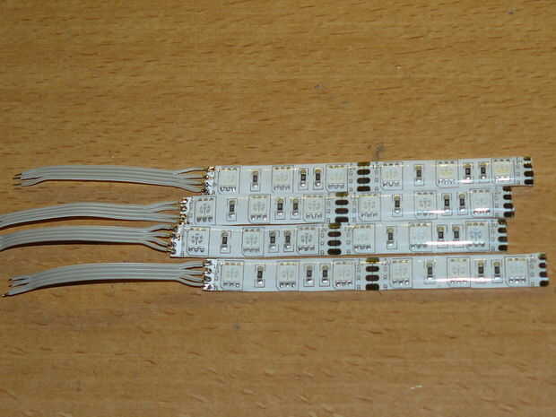 - La soldadura de las longitudes de cable de 4 hilos para las tiras rgb, luego a los módulos (ver polaridad al soldar las tiras. Es más fácil si pretin los contactos de la tira led y pretin también los alambres del cable. Esto asegurará una conexión perfecta cada vez.