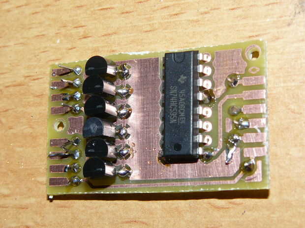 - Los transistores BC547B son próximos. Colocarlos en la parte superior hacia la manera mostró en la imagen. Les de la soldadura en la parte inferior, el exceso de clip (guardarlos, necesitaban otra vez en el paso 3) y la soldadura de la parte superior de los transistores en las piernas hacia el 74HC595.