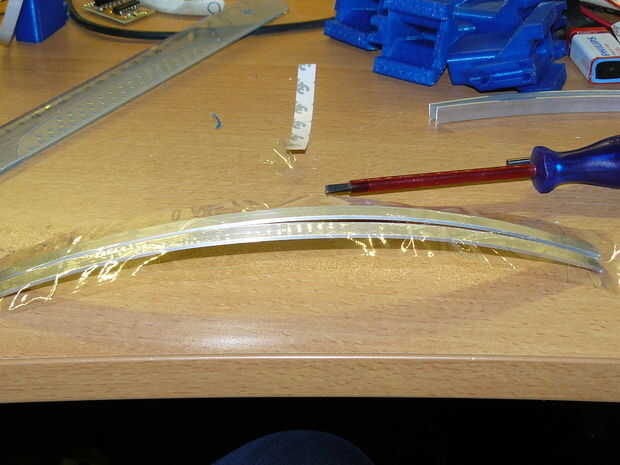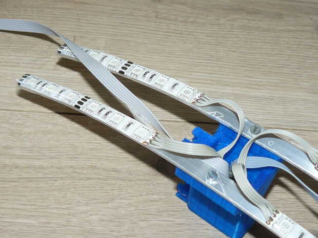 - Cáscara de la protectora de la cinta de la parte posterior de las tiras led y péguelos al aluminio. Sólo el lado con la tira de aluminio debe añadirse por ahora.
