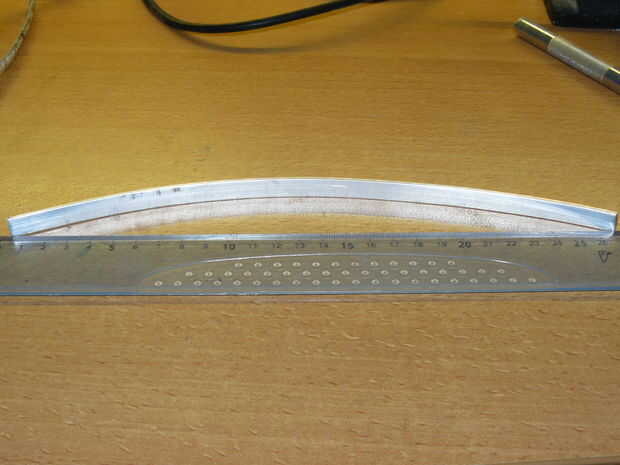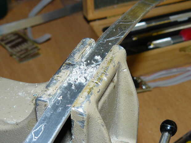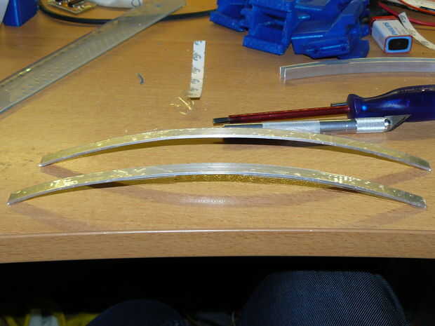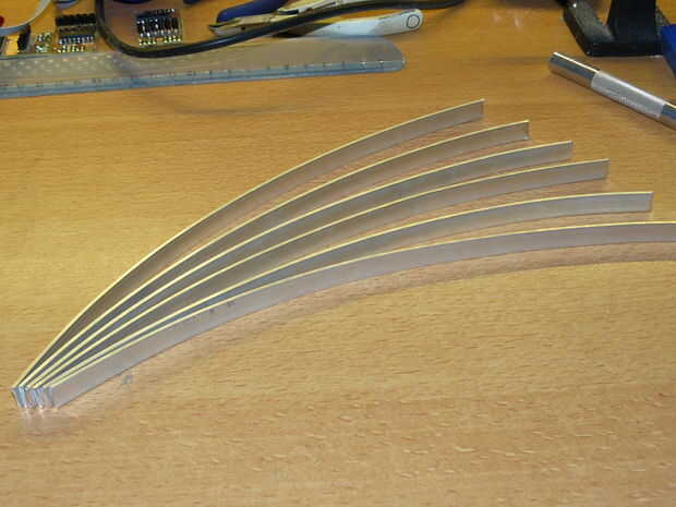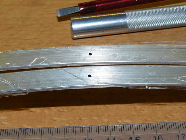 - Utilice 2 alicates para doblar cuidadosamente las tiras de aluminio. El radio exacto debe determinarse en su rueda. No doblar alrededor de los orificios perforados, se doble allí. Una punta corta: esfuerzo de torsión de la curva en un círculo, curvas en una parábola de la fuerza. Queremos círculo, así que apretar, no de la fuerza.