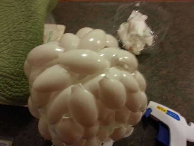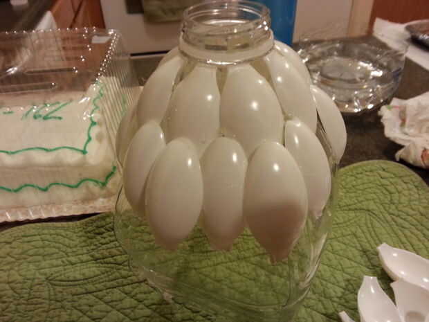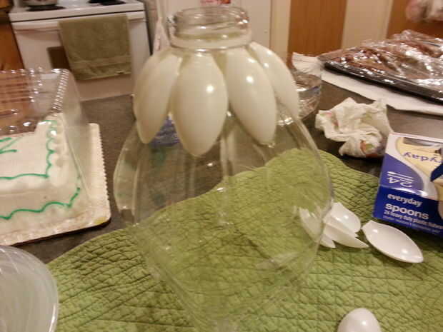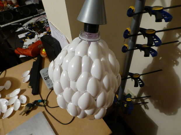 Miré un montón de diferentes geometrías frescos para hacer esta parte antes de decidirse a ir por ella. Google "lámpara de cuchara" para obtener algunas ideas aquí. Pero si no quieres ser tan tedioso y solo quiere crearlo (o utilizan este proyecto para los niños más pequeños), acaba de empezar pegando! Lo peor que sucede es que tienes que añadir un par cucharas aquí y allá para cubrir los agujeros que te perdiste. Su objetivo primario es sólo cubrir toda la superficie en cabeza de la cuchara.