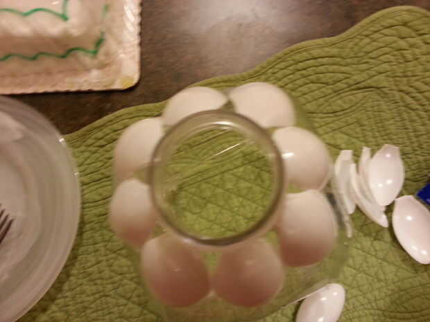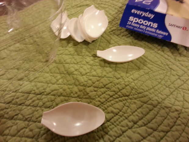 En cuanto a la técnica de pegado... Colocan una gota (tamaño de guisante) de pegamento en la punta y la base de la parte inferior de cada cabeza de cuchara vuelta boca abajo y lo colocó donde yo quería. Espera un minuto y se procede a la siguiente. Experimenté con algunas otras técnicas, pero que parecía la más fácil de hacer.