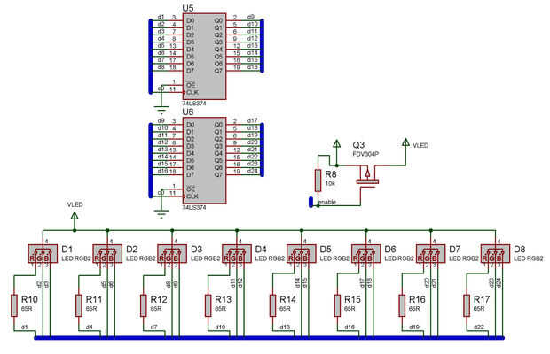Para manejar los LEDs utilizo 8 pines de datos desde el microcontrolador y un pin de reloj. Los 8 datos pines están conectados a la entrada del buffer octal primer IC y los cátodos de los 8 primeros LEDs. Las 8 salidas del primer tampón CI entonces se alimentan a las 8 entradas del búfer segundo IC y los cátodos de los LEDs del segundo 8. La señal de reloj se alimenta a todo el búfer de ICs para que juntos del reloj al mismo tiempo. Con esta técnica consigues (8 + 1) * 8 = 72 bits de control o 72 / 3 = 24 LEDs RGB. Si se utilizaron 11 ICs de búfer la cantidad de LEDs RGB va hasta 32.