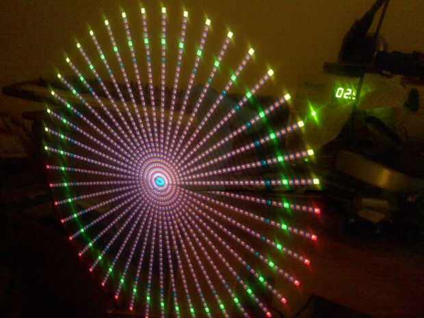 Los LEDs que utiliza son muy pequeño ánodo de común tipo SMD LEDs que compré de Farnell. Eran caros pero vienen con un lente y se ven muy bien iluminado. También son muy pequeños y originalmente trataba de una pantalla de 32 LED utiliza un LED mucho más grande aunque esto funcionó muy bien fue un poco demasiado grande para estar girando a alta velocidad sin cualquier jaula de seguridad.